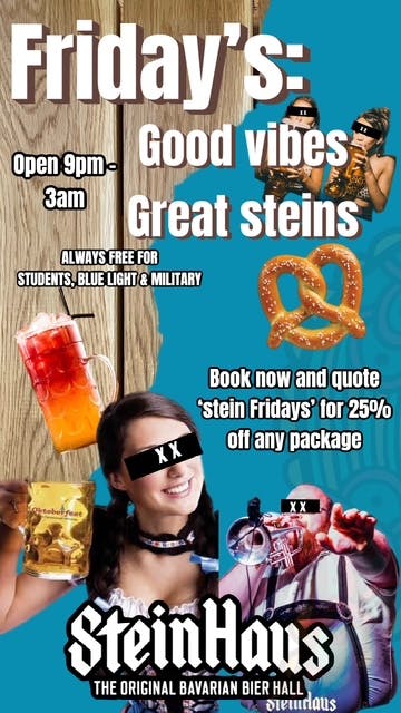 A little party never killed nobody, and we offer 25% off all Food & Drink packages every Friday. We have our resident DJ’s every week until 3am, you’ll hear all the best Indie, R&B, old-school bangers to current chart-blasters! Grab your Stein and get on them benches.